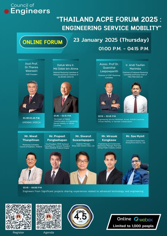 Thailand ACPE Forum 2025 on "Engineering Service Mobilty", will be held online on January 23, 2025 at 01:00 P.M. - 04:15 P.M. (GMT+7).